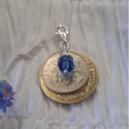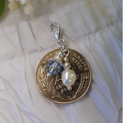 Ce ravissant cadeau pour les mariées et un souvenir bien pensé pour les années à venir. Ce charm constitué de véritables pièces de 20 centimes Marianne "Lagriffoul" et de 6 pence Britannique. Des apprêts en argent 925 et d'une perle de cristal Autrichien Light Saphir de chez « Preciosa ».