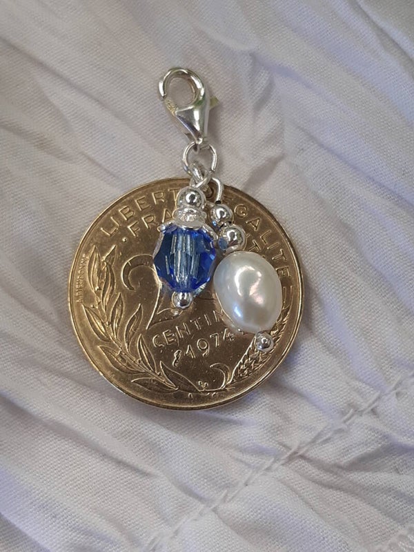 Ce charm est constitué d’une véritable pièce de 20 centimes Marianne "Lagriffoul"et d’apprêts en argent 925. D’une perle d’eau douce baroque irrégulière de Grade AA Blanc. Et d'une perle de cristal Autrichien Saphir de chez « Preciosa ».