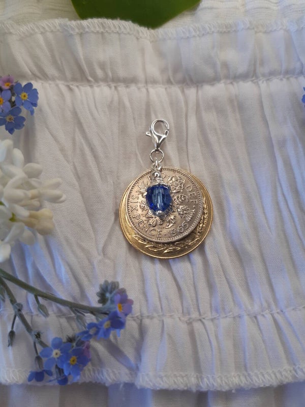 Ce charm constitué de véritables pièces de 20 centimes Marianne "Lagriffoul"et de 6 pence Britannique. D’apprêts en argent 925 ainsi que d’une perle de cristal Autrichien Saphir de chez « Preciosa ».