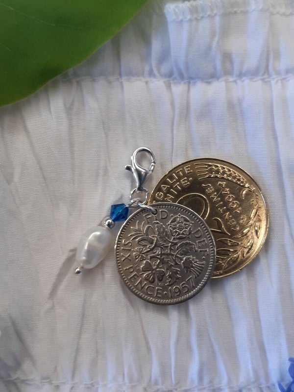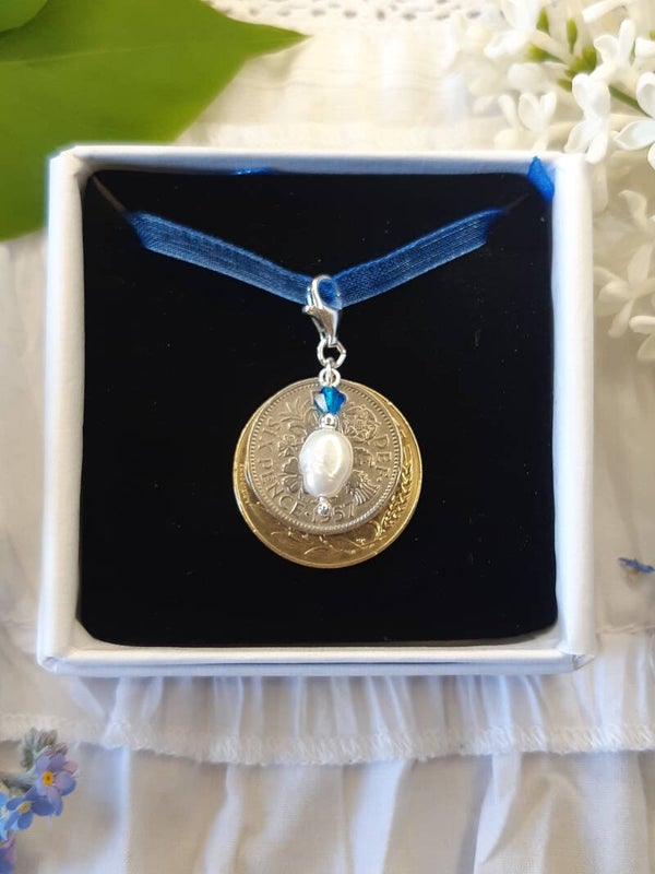Ce charm constitué de véritables pièces de 20 centimes Marianne "Lagriffoul" et de 6 pence Britannique. D'apprêts en argent 925, d’une perle d’eau douce baroque irrégulière de Grade AA Blanc et d’une perle de cristal Autrichien Capri blue de chez « Preciosa ».