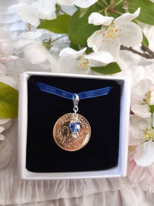 Un magnifique cadeau pour les mariées et un souvenir pour les années à venir. Ce charm original est constitué d’une véritable pièce 20 centimes Marianne "Lagriffoul" et d’apprêts en argent 925, d'une perle cristal Autrichien Saphir de chez « Preciosa ». Ce bijou fait main est unique en raison de sa composition et réalisé spécialement pour vous.