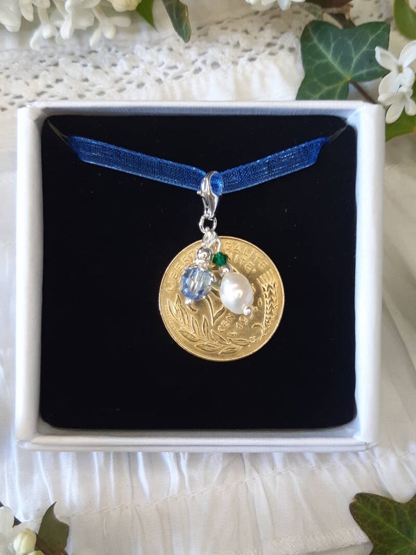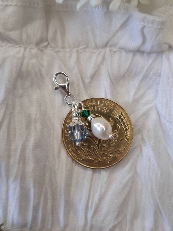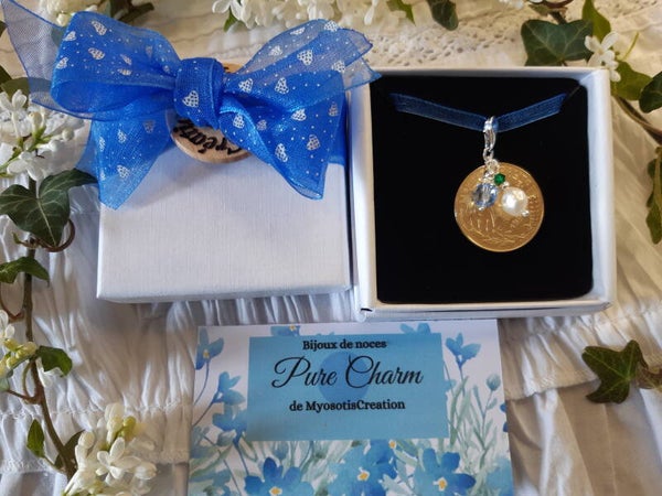 Un beau souvenir pour la future mariée ce charm est constitué d’une véritable pièce de 20 centimes Marianne "Lagriffoul" et d’apprêts en argent 925. D’une perle d’eau douce baroque irrégulière de Grade AA Blanc, de perles de cristal Autrichien Light Saphir et Emeraude de chez « Preciosa ».