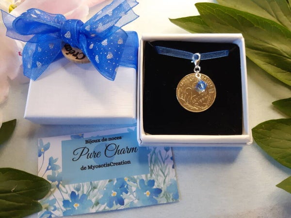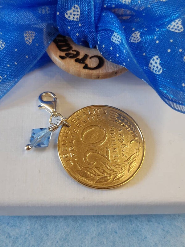 Ce charm est réalisé d’une véritable pièce de 20 centimes Marianne "Lagriffoul" et d’apprêts en argent 925. D'une perle toupie de cristal Autrichien Saphir ou Light Saphir de chez « Preciosa ».