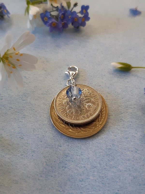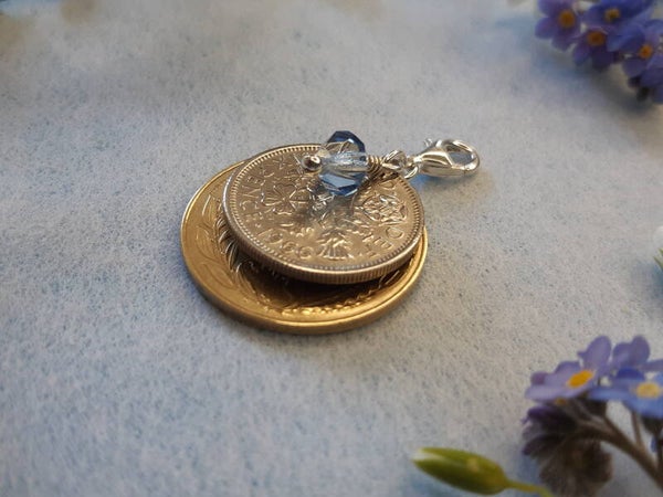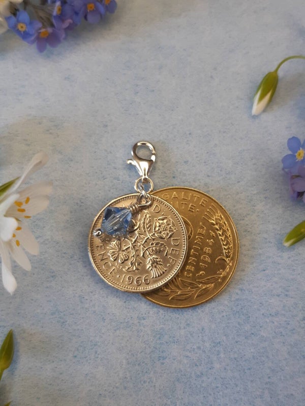 Ce charm constitué de véritables pièces de 20 centimes Marianne "Lagriffoul"et de 6 pence Britannique. D’apprêts en argent 925 ainsi que d’une perle toupie de cristal Autrichien Saphir de chez « Preciosa ».